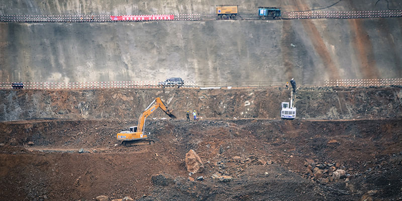 Hours later we round a corner and see the signs of construction, open-cut hillside bare to the bedrock, trucks and excavators, and jungle streams flowing into the river via concrete drains.