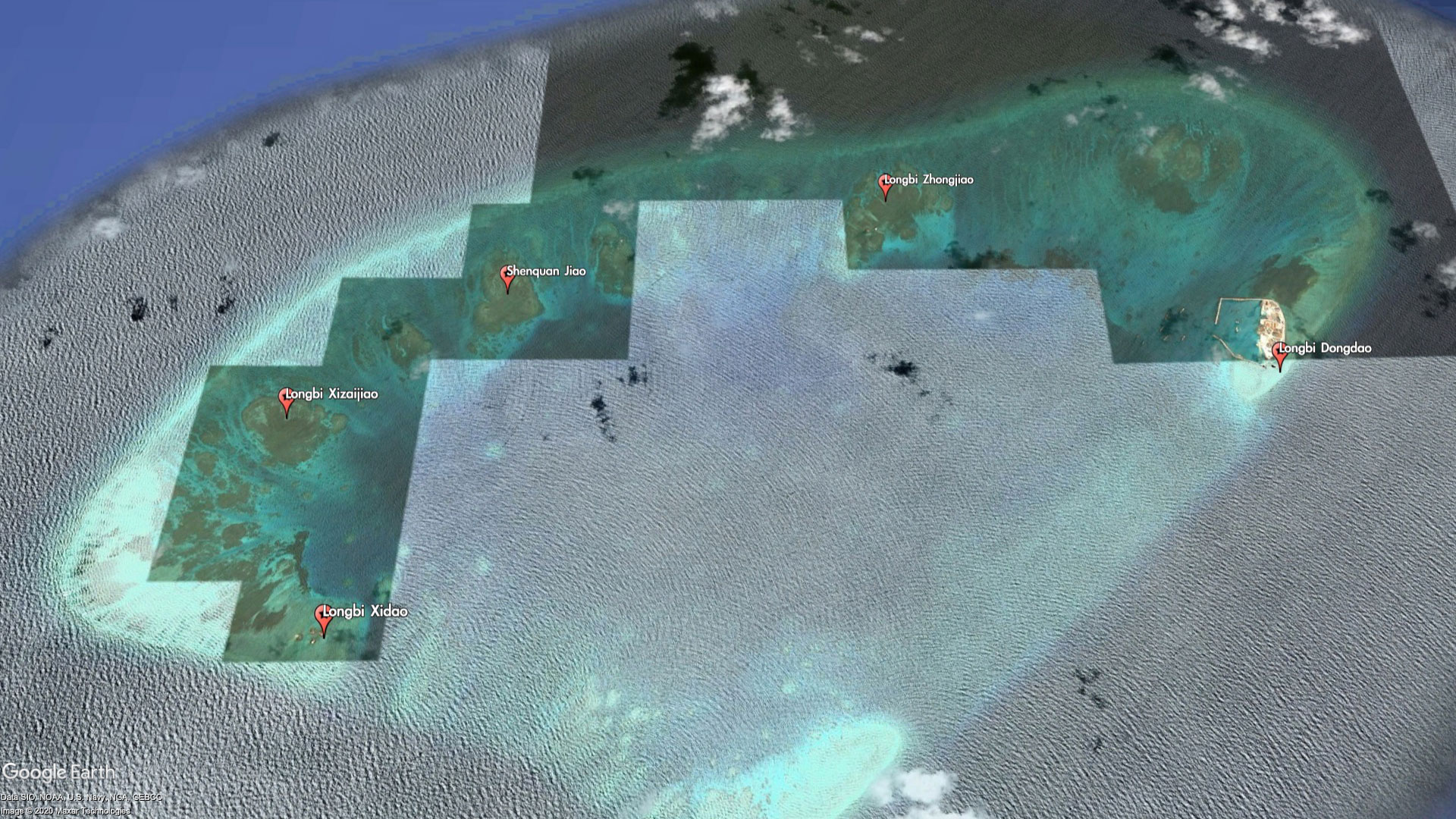 Other new features are clearly meant to plug the gaps between and around China's military outposts and artificial islands. Guangjin Beiyidao and Guangjin Bei'erdao (Guangjin North First Island and Guangjin North Second Island) are indistinguishable from each other, and China lists the same coordinates for both of them, but together with Guangjin Xidao (Guangjin West Island) they make up the small sand barrier on the western side of Duncan Island, which houses a Chinese-built harbor and outpost.